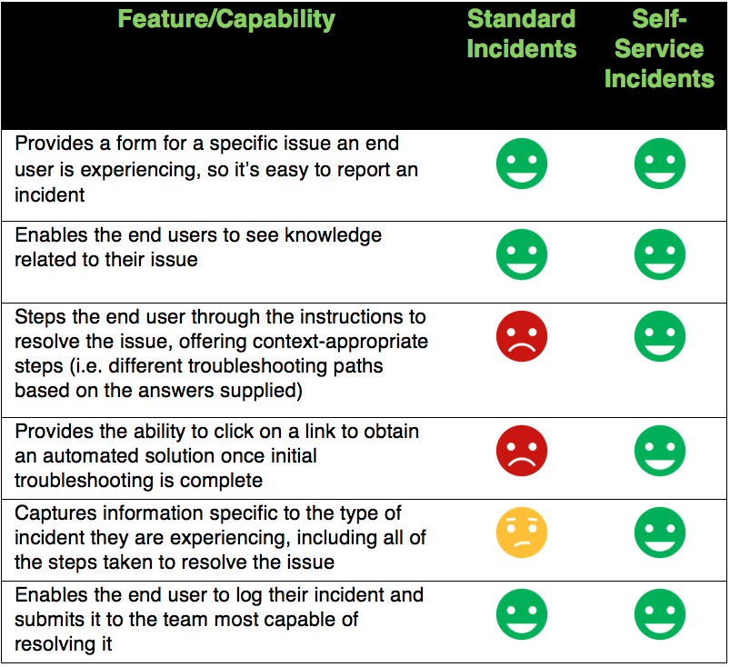 Figure 1. How true self-service incidents compare to standard incidents from a features and capabilities perspective.